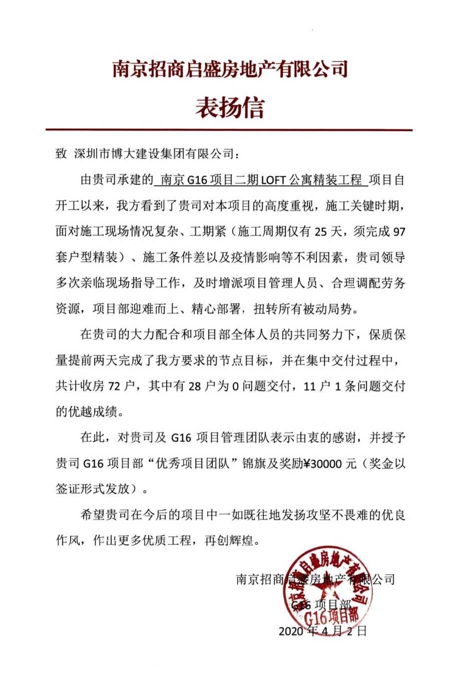 博大建設集團在南京G16項目二期LOFT公寓精裝工程中,迎難而上,積極解決工期問題,以高標準的質量,提前完成節(jié)點目標,受到客戶的表揚,并榮獲“優(yōu)秀項目團隊”榮譽。