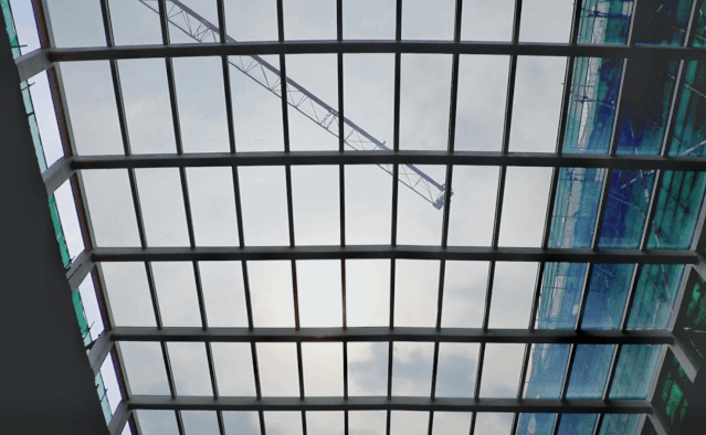 144塊玻璃、一塊400多斤,在接到甲方的施工要求后,博大僅用一天半的時(shí)間,便在高達(dá)15米的屋面完成調(diào)光玻璃幕墻的安裝。